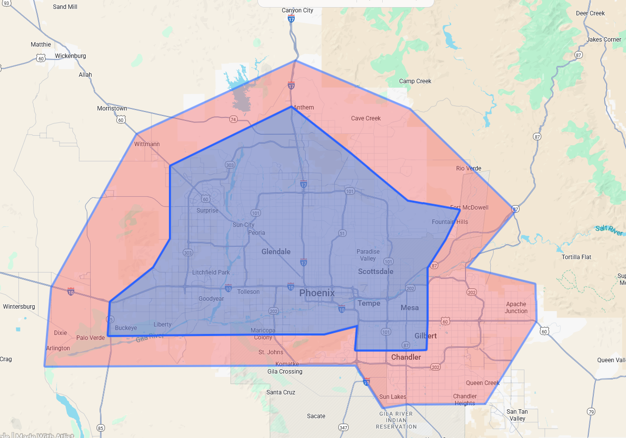Bookings inside of the Red area will incur a flat $30 travel charge. Please inquire directly about areas outside of the highlighted areas.
