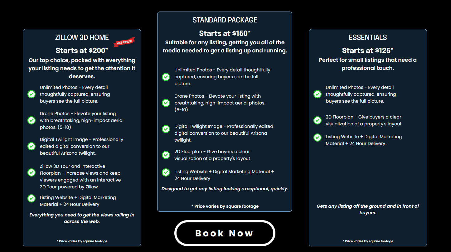 Unlimited Photos - Every detail thoughtfully captured, ensuring buyers see the full picture.Drone Photos - Elevate your listing with breathtaking, high-impact aerial photos. (5-10)Zillow 3D Tour and Interactive Floorplan - Increase views and keep viewers engaged with an interactive 3D Tour powered by Zillow. Digital Twilight Image - Professionally edited digital conversion to our beautiful Arizona twilight. Listing Website + Digital Marketing Material + 24 Hour DeliveryEverything you need to get the views rolling in across the web.